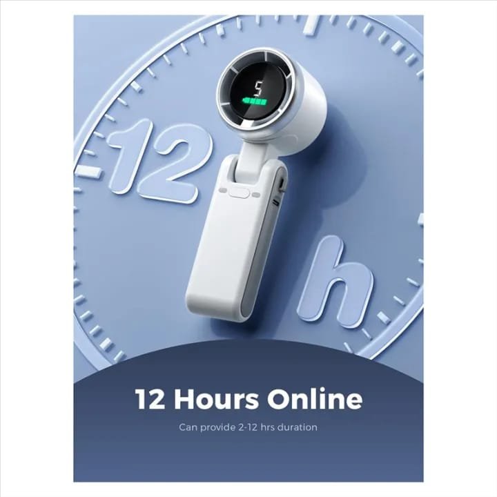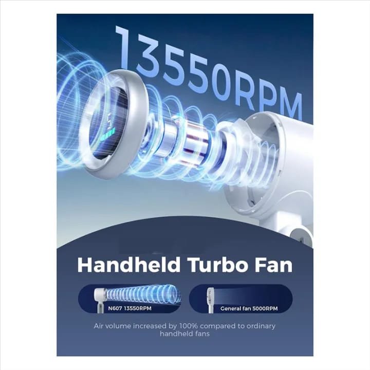 Ultimate Cooling Experience – This N607 handheld turbo fan adopts an advanced 6-blade design and is equipped with a high-speed three-phase brushless motor, with a maximum wind speed of up to 10m/s. Maximum speed is 13,550 rpm, which is 3 times that of ordinary handheld fans. Perfect for relieving the heat during hot journeys.
